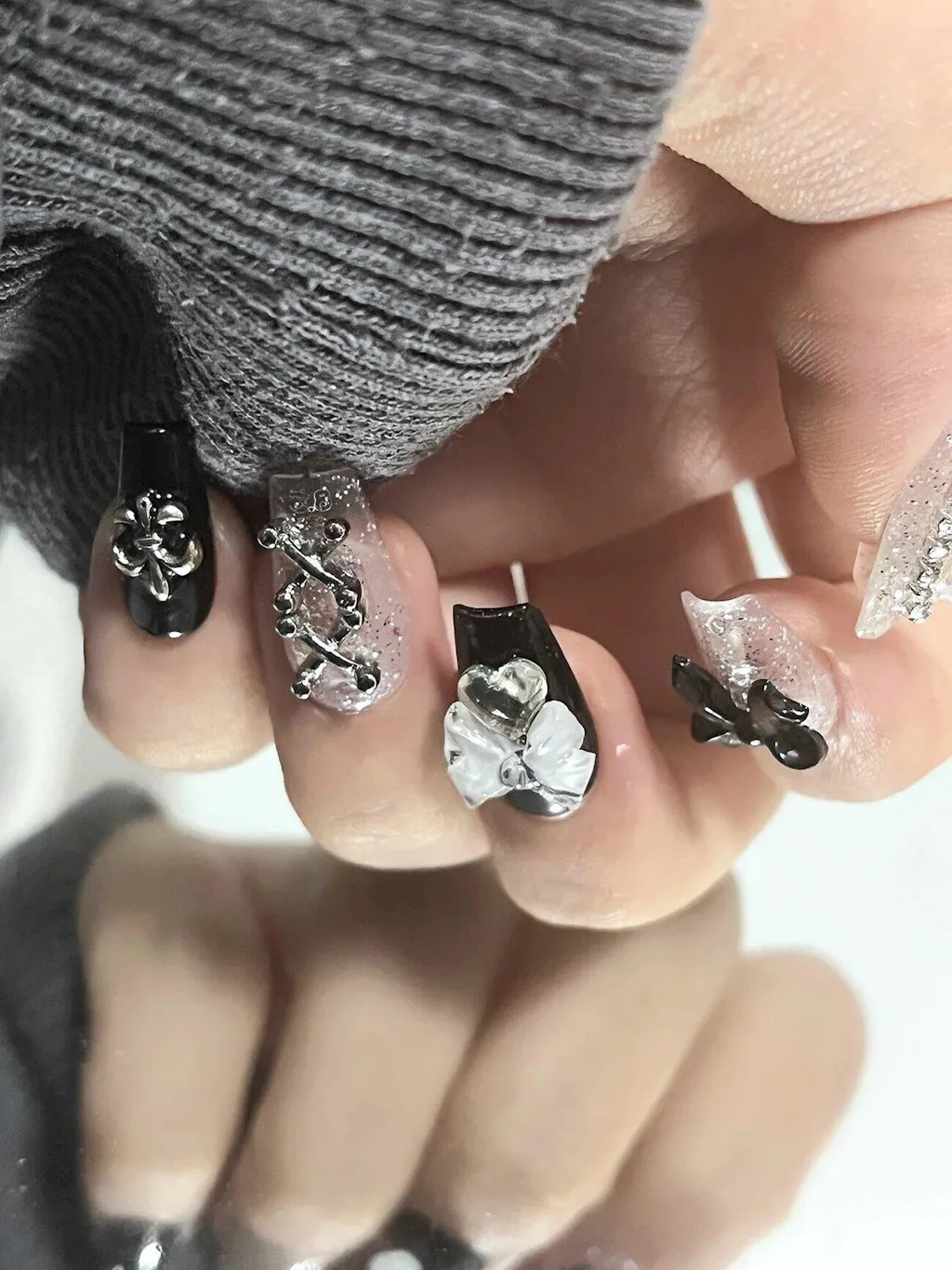 Détail ongles press-on Bow Teddy – finition noire brillante et éléments décoratifs raffinés